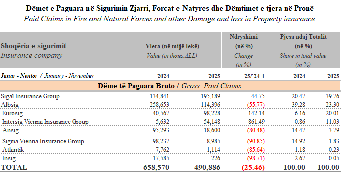 Konkretisht, SIGAL IG pagoi, në 11 muajt e parë të vitit 2025, 195,189,000 Lekë dëme, afërsisht 2,021,000 euro, ose 44.75% më tepër se sa e njëjta periudhë e një viti më parë.