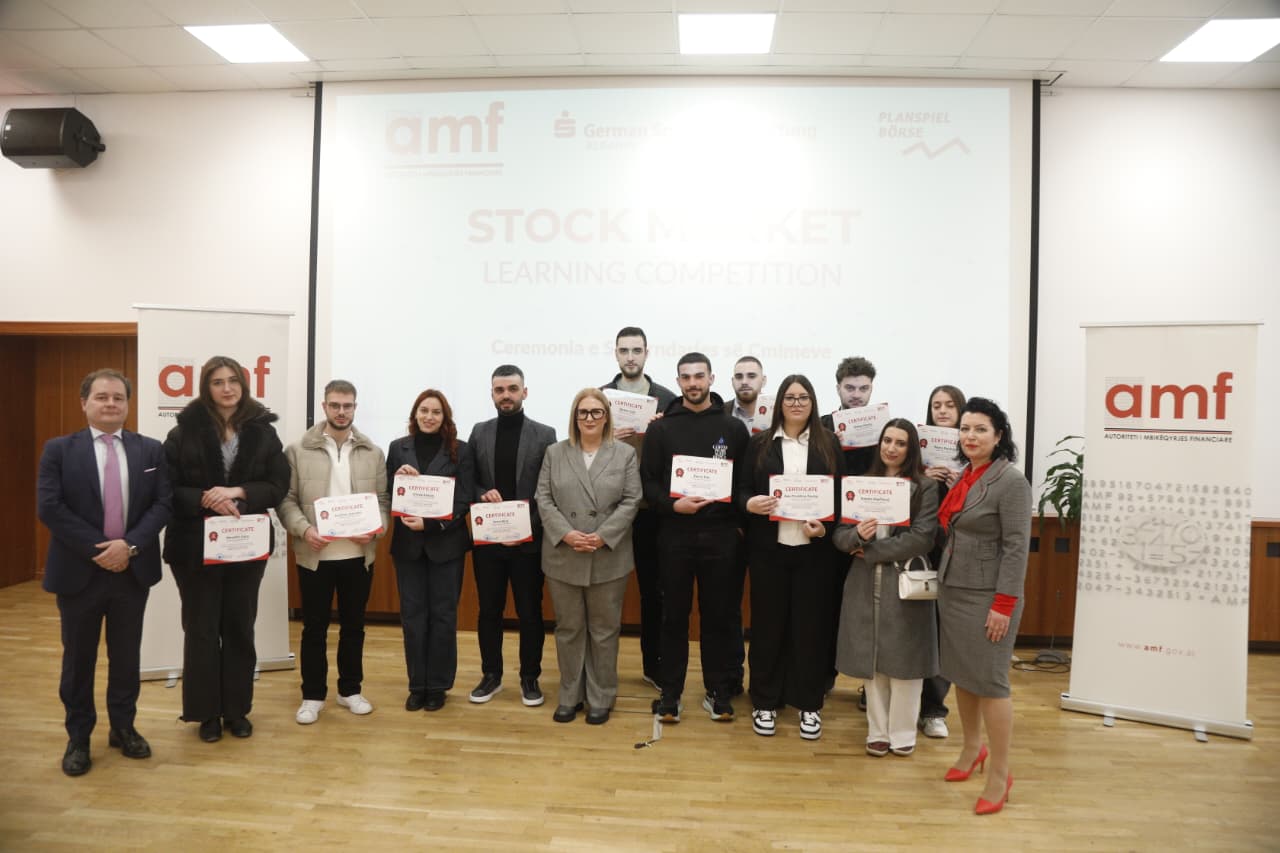 Në një ceremoni ku konkurrenca mes studentëve u ndërthur me gjuhën e riskut dhe strategjisë financiare, u përmbyll edicioni i pestë i konkursit “Të mësojmë për bursën” (Stock Market Learning Competition), një nismë e mbështetur nga Autoriteti i Mbikëqyrjes Financiare në bashkëpunim me German Sparkassenstiftung Albania.
