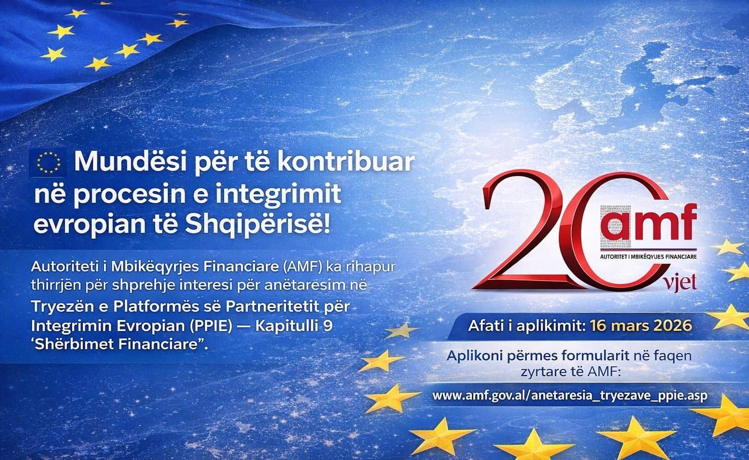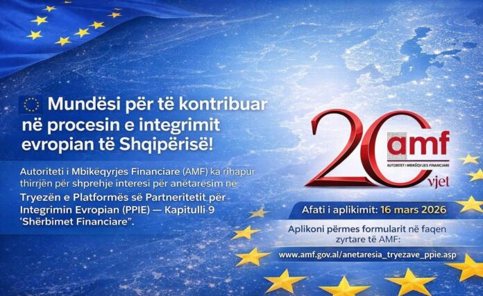 Autoriteti i Mbikëqyrjes Financiare (AMF), përmes një publikimi në kanalet e saj të komunikimit në rrjete sociale, ka rihapur thirrjen për shprehje interesi për anëtarësim në Tryezën e Platformës së Partneritetit për Integrimin Evropian (PPIE), Kapitulli 9 “Shërbimet Financiare”.