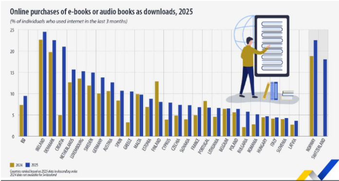Ndër vendet e BE-së, përqindjet më të larta të popullsisë që blejnë libra elektronikë dhe libra audio u regjistruan në Irlandë (24.5%), Danimarkë (22.5%) dhe Kroaci (21.0%).