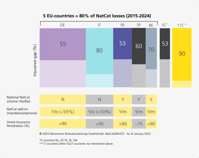Hendeku relativisht i lartë i mbrojtjes në Spanjë (60%) dhe Francë (53%), ku ekziston një skemë shtetërore NatCat, krahasuar me Gjermaninë (55%) pa skemë shtetërore, tregon se një skemë shtetërore nuk zvogëlon automatikisht hendekun e mbrojtjes dhe se faktorë të tjerë, si përhapja e sigurimit të banesave dhe përdorimi i shtesave opsionale NatCat, luajnë një rol thelbësor.