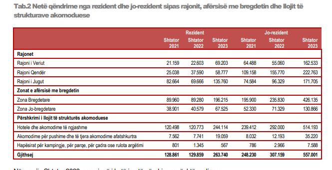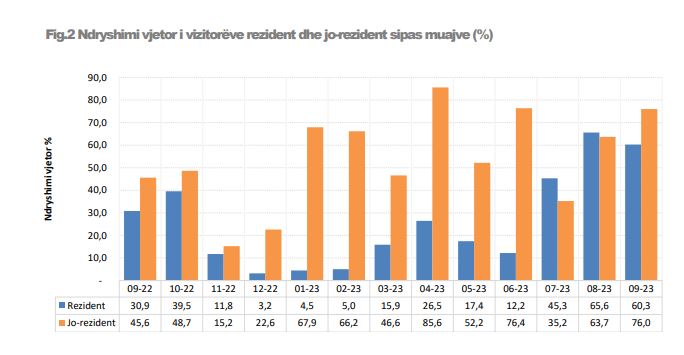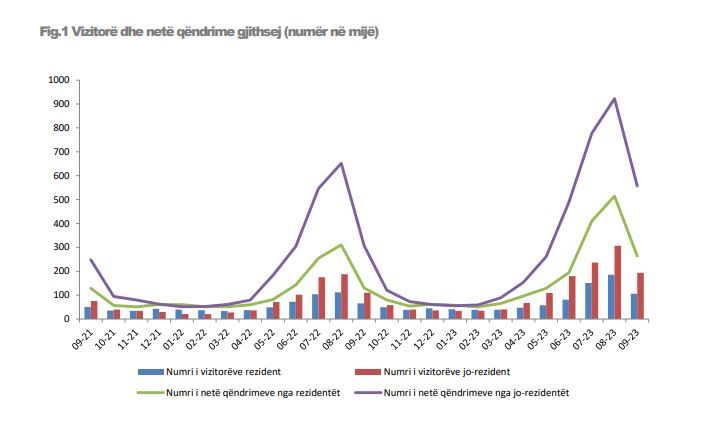 Sipas të dhënave të INSTAT, numri i vizitorëve gjithsej është rritur me 70,1 %, në krahasim me Shtator 2022. Të njëjtën ecuri ndjekin edhe dy treguesit e mëposhtëm: