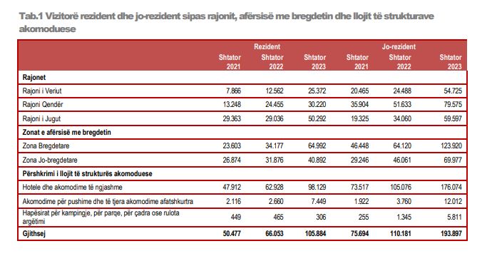 Në Zonat Bregdetare ky tregues është rritur me 93,3 %, krahasuar me të njëjtën periudhë të vitit të mëparshëm. Numri i vizitorëve jo-rezident të cilët janë akomoduar në “Hotele dhe akomodime të ngjashme” ka shënuar rritje me 67,6 %
