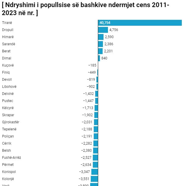 Bashkitë e Shkodrës, Elbasanit, Durrësit, Vlorës dhe Fierit kanë pësuar rënien më të madhe të popullsisë në numër me të dhënat e cens 2011 dhe 2023, në anën tjetër rritjen më të madhe të popullsisë në numër e ka Bashkia e Tiranës, Dropullit, Himarës dhe Sarandës