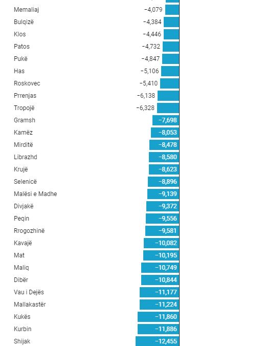 Nga 61 bashki vetëm në 6 bashki popullsia shënoi rritje ndërmjet censeve ndërsa në 55 prej tyre ishte në rënie.