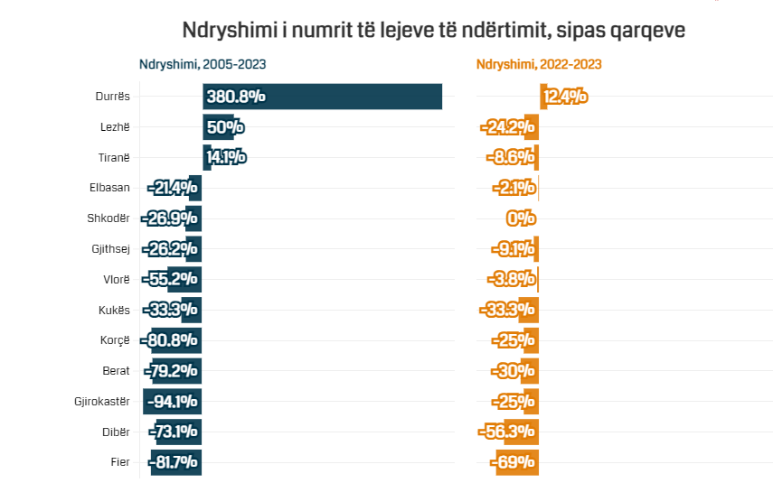 Qarku i Durrësit duket se ka patur “hovin” më të madh. Rritja e numrit të lejeve të ndërtimit në vitin 2023 është rreth 380%, krahasuar me vitin 2005. Ky qark në vitin 2023 regjistron numrin më të lartë të lejeve të ndërtimit përgjatë gjithë viteve, me 500 të tilla. Ndërkohë, ndryshimi vjetor për këtë qark është 12.4%. Kjo ritje në Durrës vjen edhe si pasojë e rindërtimit nga tërmeti i vitit 2019.