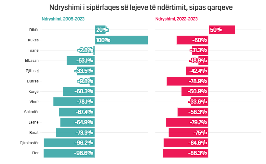 Të dhënat tregojnë se, që nga viti 2005 deri në vitin 2023, pra në 18 vite, vetëm tre qarqe kanë regjistruar rritje të numrit të lejeve të ndërtimit.