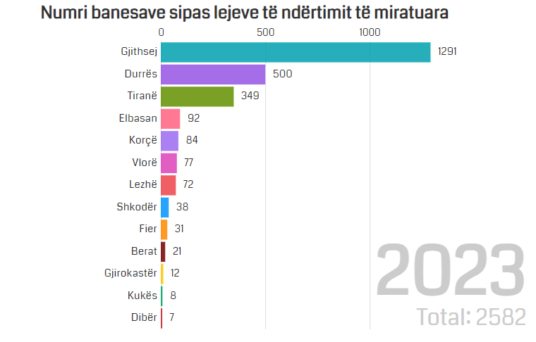 Numri total i lejeve të ndërtimit në Shqipëri përgjatë vitit 2023 u regjistrua në 1,602, duke shënuar një rritje prej 13%, krahasuar me vitin 2022.