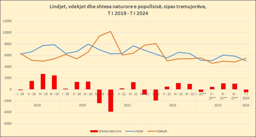 Të dhënat zyrtare të INSTAT referojnë se në 3-mujorin e parë të vitit 2024 numri i lindjeve ishte 5,056, duke shënuar një rënie me 6,8%, krahasuar me tremujorin e parë 2023. Lindjet në tremujorin e parë 2024 shënuan nivelin më të ulët historik me bazë tremujore së paku që nga viti 1990.