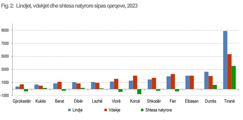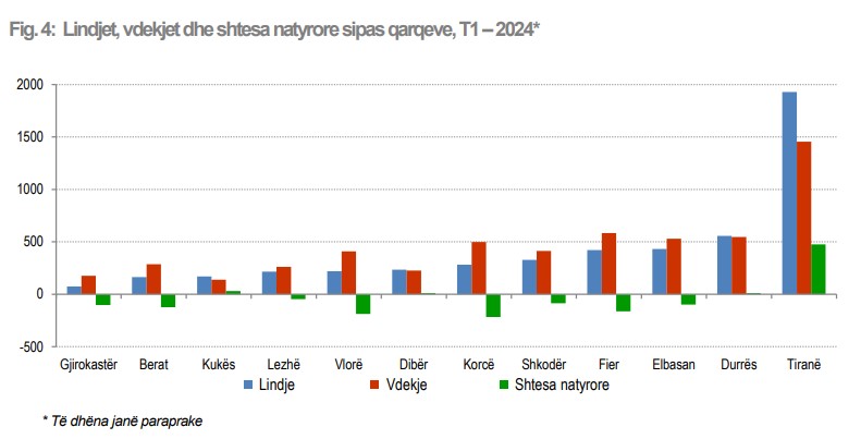 Në tremujorin e parë 2024, qarku me shtesën natyrore më të lartë është Tirana, me 475 lindje më shumë sesa vdekje, ndërsa qarku me shtesën natyrore më të ulët është Korça, me 217 vdekje më shumë se sa lindje.
