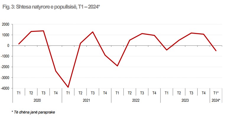 Shtesa natyrore e popullsisë, në tremujorin e parë 2024 regjistron 481 vdekje më shumë se sa lindje.