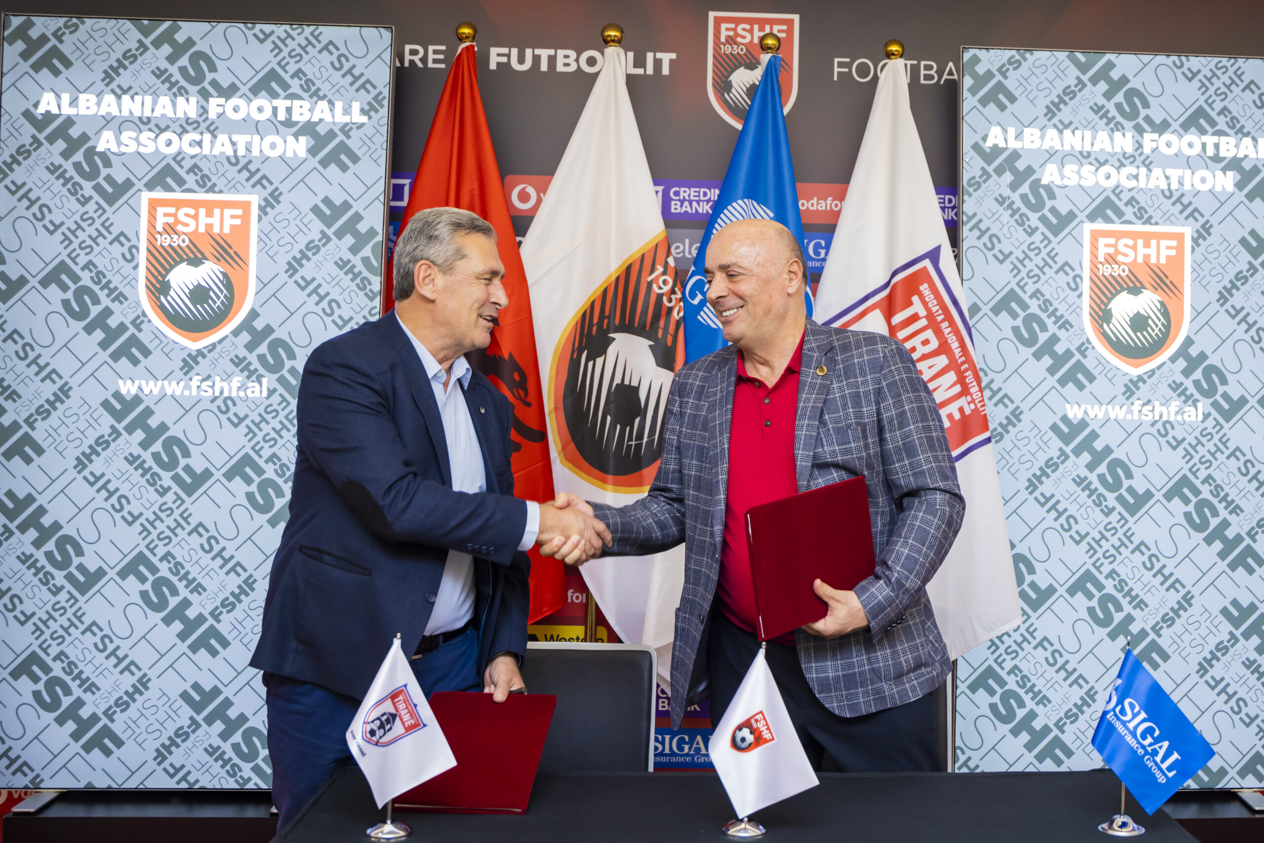 Presidenti i SIGAL Insurance Group, z. Avni Ponari, dhe kryetari i Shoqatës Rajonale të Futbollit Tiranë, z. Krenar Alimehmeti, nënshkruan një marrëveshje njëvjeçare bashkëpunimi në mjediset e Federatës Shqiptare të Futbollit.