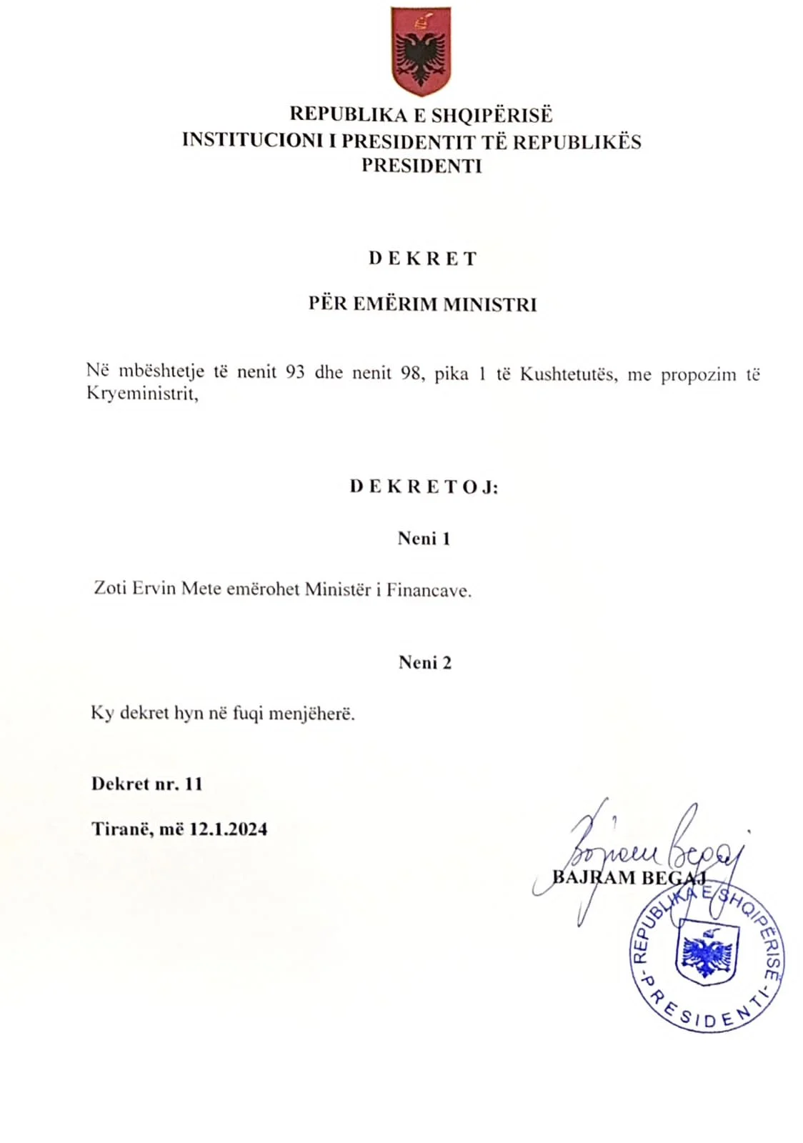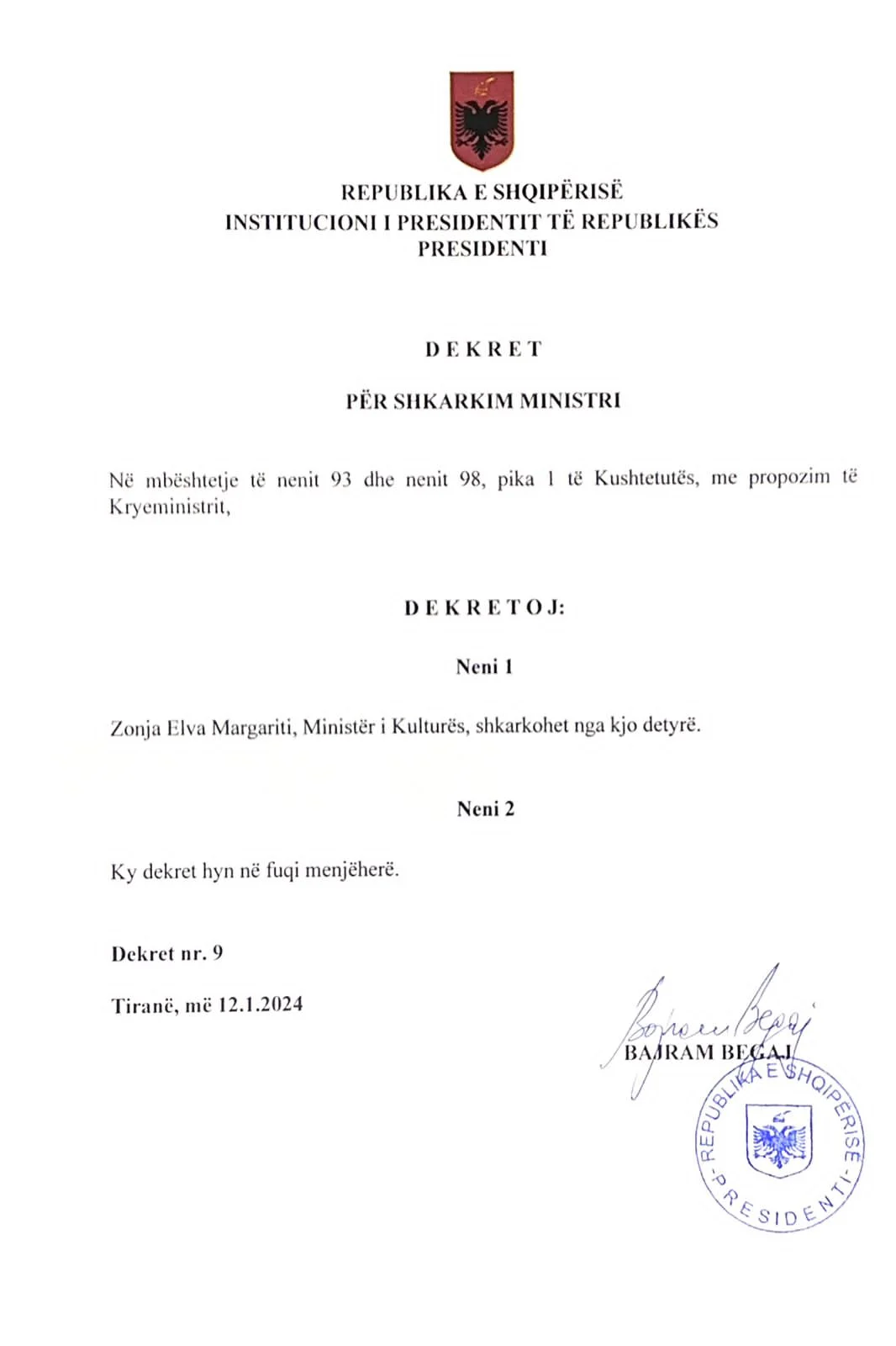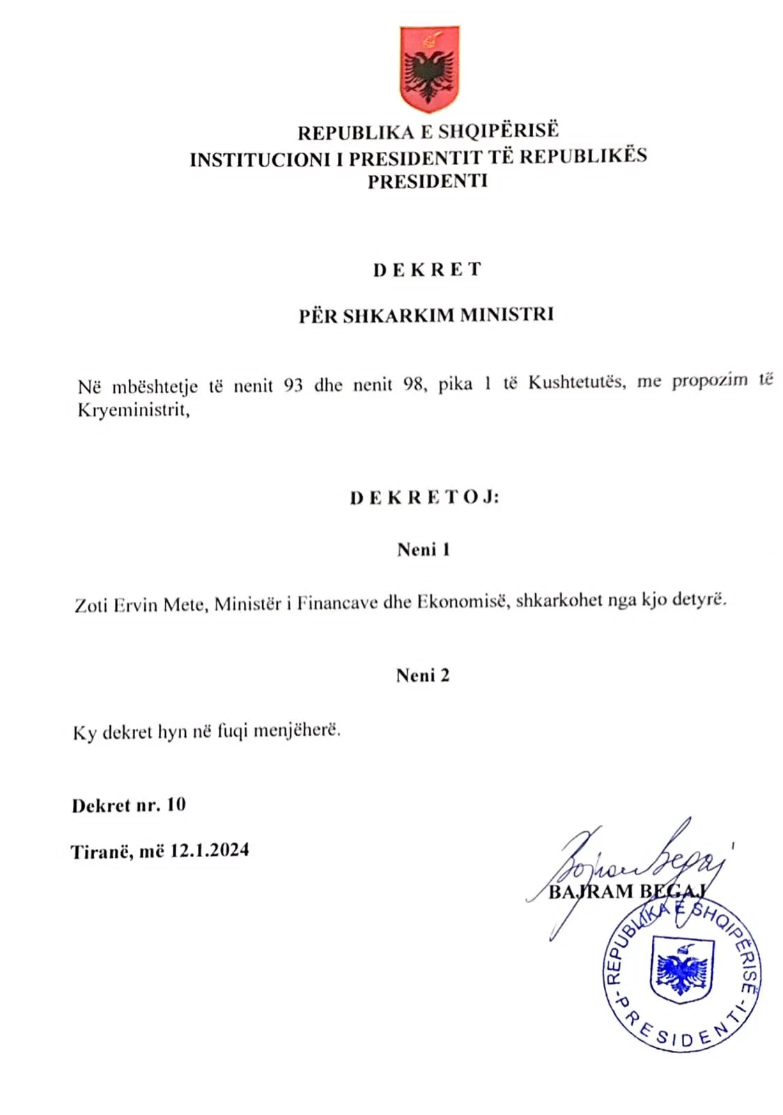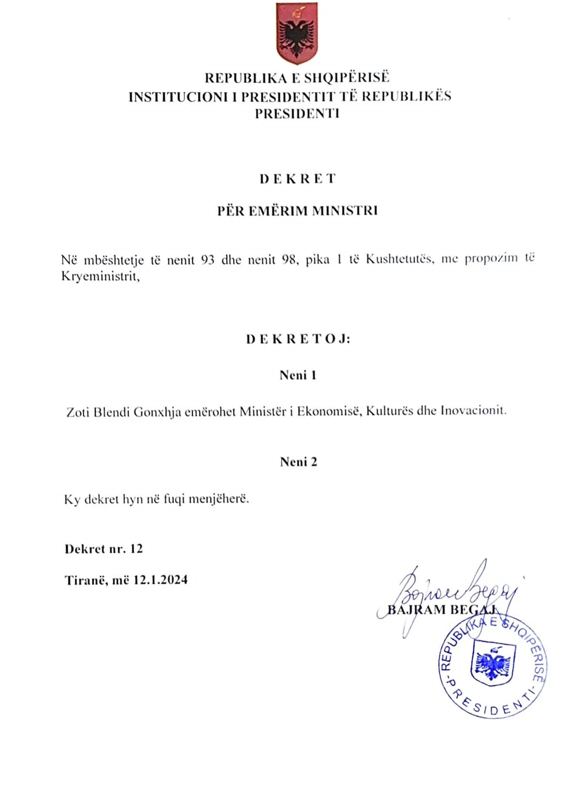 Po ashtu, Presidenti dekretoi edhe Blendi Gonxhen në strukturën e re qeverisëse që u krijua pak ditë më parë, Ministrinë e Ekonomisë, Kulturës dhe Inovacionit.