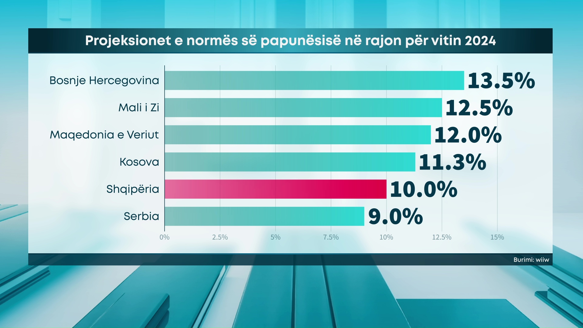 Sipas Institutit të Vienës, norma e papunësisë në Shqipëri në vitin 2024 pritet të jetë 0.5% më e ulët se në vitin 2023, ose 9.5%.