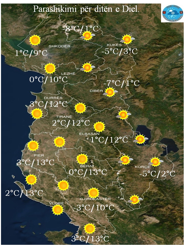 Vlera minimale në vendet malore pritet të shkojë në -8 gradë Celsius, ndërsa në zonat e ulëta dhe bregdetare do të shkojnë në -2 dhe 0 gradë Celsius. Ndërsa temperaturat e mesditës, pritet të kapin vlerat 10 deri në 13 gradë Celsius. Të mërkurën e javës që vjen, mund të kemi një rritje të lehtë të temperaturave, duke arritur në 16 dhe 17 gradë Celsius.