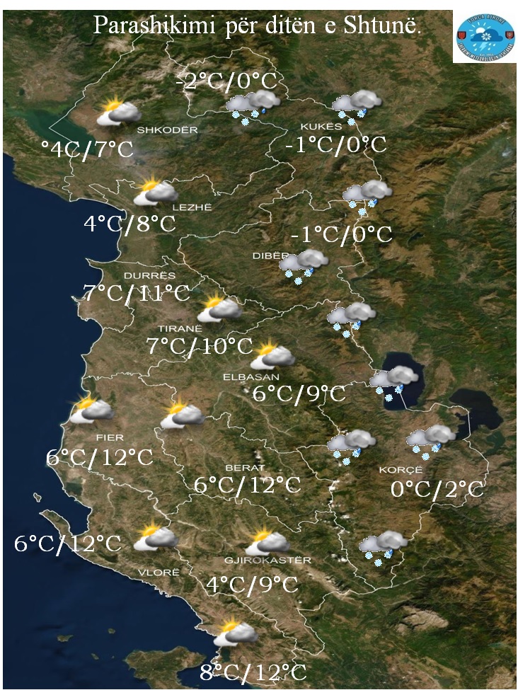 Sipas Shërbimit Meteorologjik Ushtarak, në relievet malore, në lindje, reshjet do të jenë të herëpashershme me intensitet të ulët dhe mesatare në formën e shiut, por në lartësitë mbi 700 metër, reshjet do të jenë në formën e dëborës.