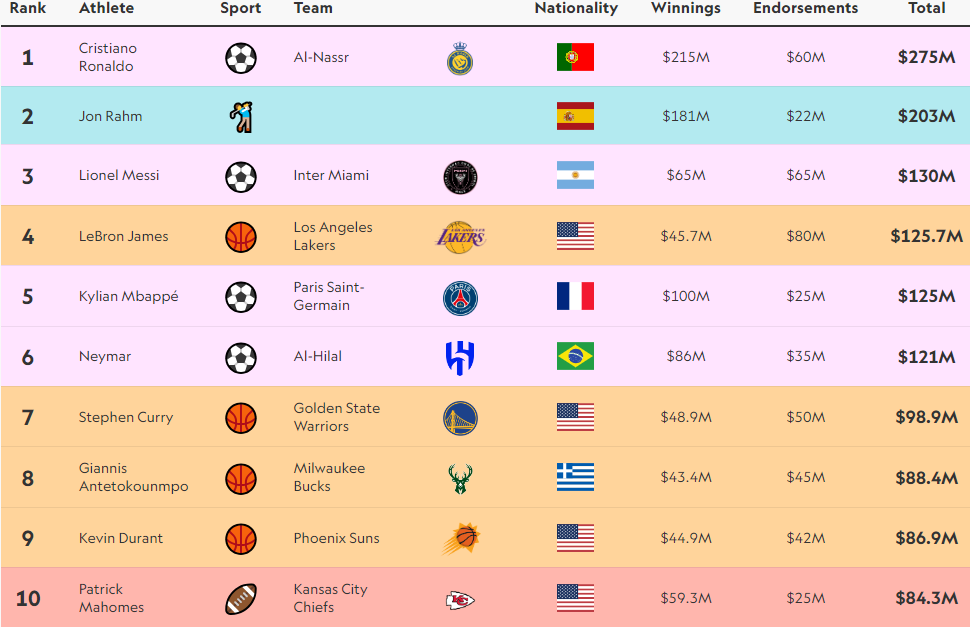 Në krye të listës mbetet Cristiano Ronaldo me një total fitimi prej 255 milionë Eurosh, i ndjekur nga lojtari i golfit Jon Rahm me 189 milionë, ndërsa podiumin e mbyll Leo Messi me 121 milionë Euro.