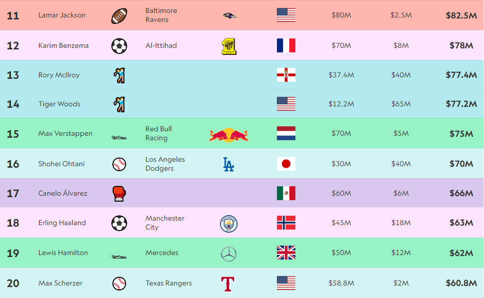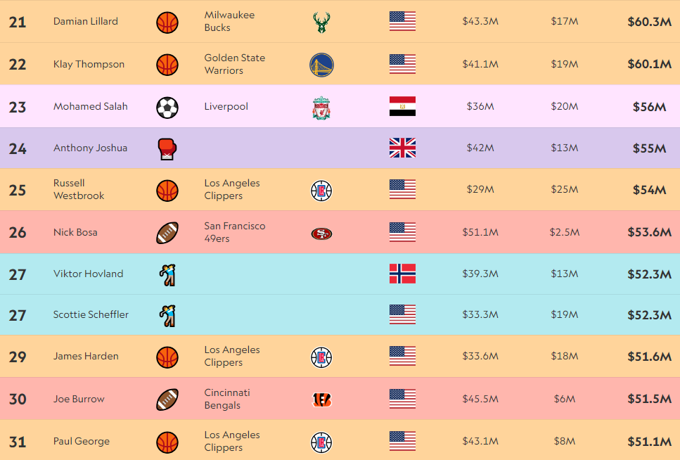 Në Top 10 kemi 4 futbollistë, 4 basketbollistë të NBA, një golfist dhe një lojtar të futbollit amerikan (rugby)