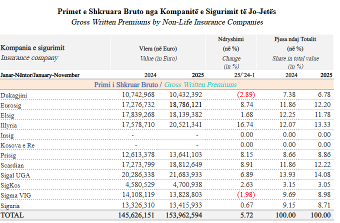 Konkretisht, vëllimi total i primeve të shkruara bruto të SIGAL Kosovës në sigurimet e jojetës është 21,683,933 euro në 11 muajt e parë të vitit 2025.