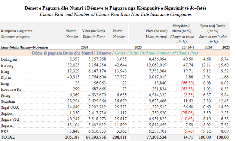 Konkretisht, 25,773 raste dëmesh u paguan me 11,279,512 euro, krahasuar me 24,049 raste që u paguan me 7,202,712 euro të njëjtën periudhë të një viti më parë.