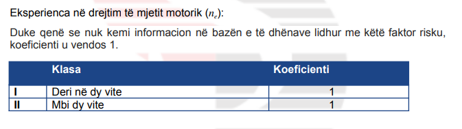 • Eksperienca në drejtimin e mjetit motorik. Të siguruarit e ndryshëm nga 18–21 vjeç dhe që kanë eksperiencë drejtimi deri në dy vite tarifohen më tepër se të siguruarit e tjerë.