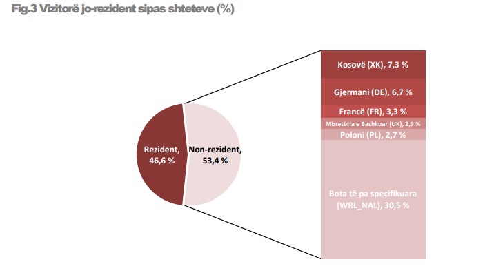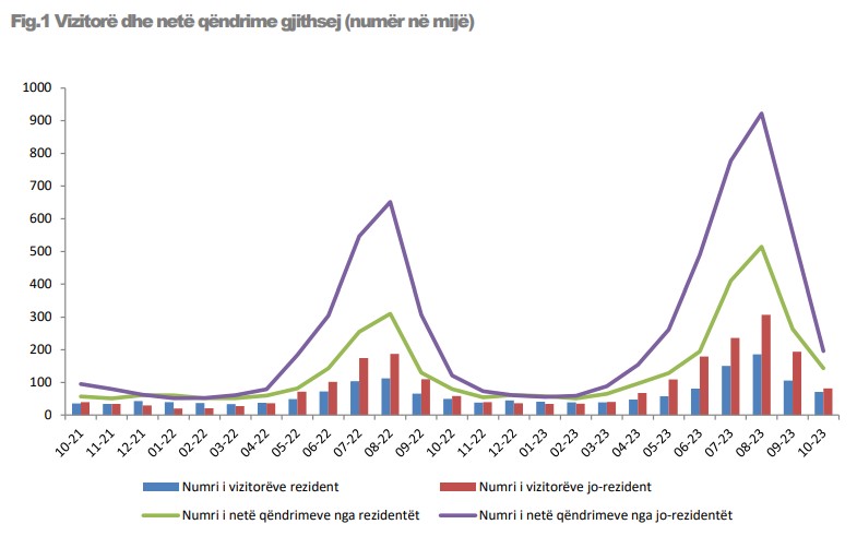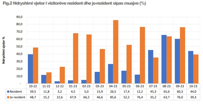 “Numri i vizitorëve gjithsej është rritur me 41,4%, në krahasim me Tetor 2022. Të njëjtën ecuri ndjekin edhe dy treguesit e mëposhtëm: numri i vizitorëve rezident është rritur me 44%; numri i vizitorëve jo-rezident është rritur me 39,3%”, thuhet në publikim.