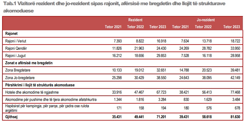 “Numri i vizitorëve jo- rezident të cilët janë akomoduar në Rajonin e Jugut ka shënuar rritjen më të lartë me 79,7%. Në Zonat Bregdetare ky tregues është rritur me 92,4%, krahasuar me të njëjtën periudhë të vitit të mëparshëm. Numri i vizitorëve jo-rezident të cilët janë akomoduar në “Hotele dhe akomodime të ngjashme” ka shënuar rritje me 37,3%”, thotë INSTAT.